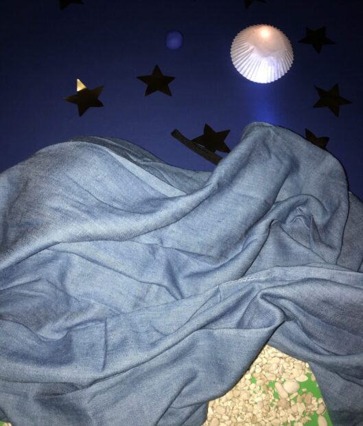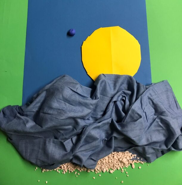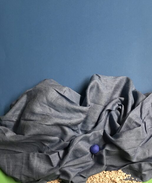 Handlung: aus blauem Stoff und mit Kies einen “Steinstrand” auflegen und die blaue Knetkugel darauf platzieren