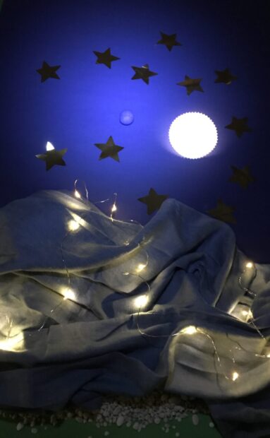 Handlung: Dunkelblaues Papier über das blaue Papier legen, die Muffinsform mit dem Rechaudlicht und die goldenen Sterne auf dem «Himmel» platzieren