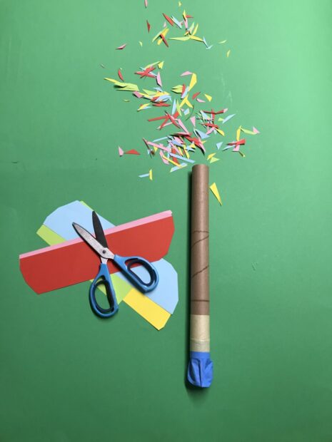 • Konfettikanone – Material: eine Kartonrolle, ein starkes Klebenband, ein Luftballon, farbiges Papier (Reste), Schere
