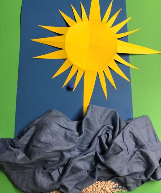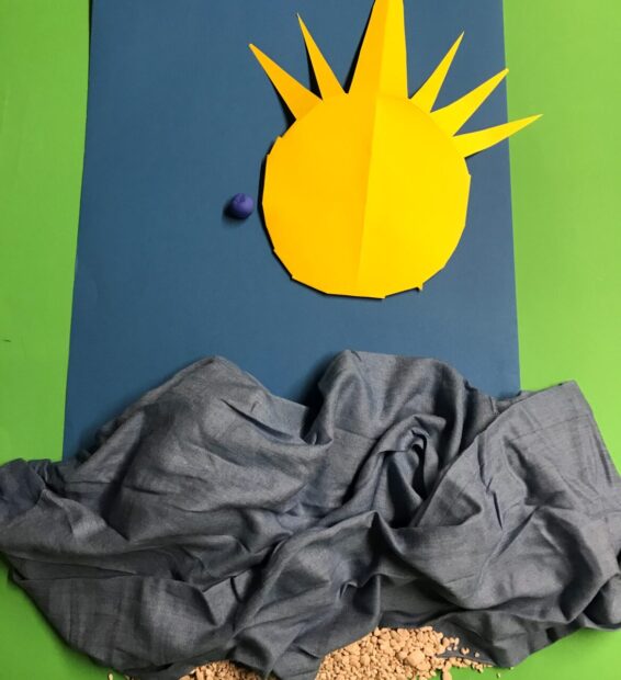 Handlung: Papiersonne kommt unter dem blauen Stoff hervor und öffnet ihre Strahlen