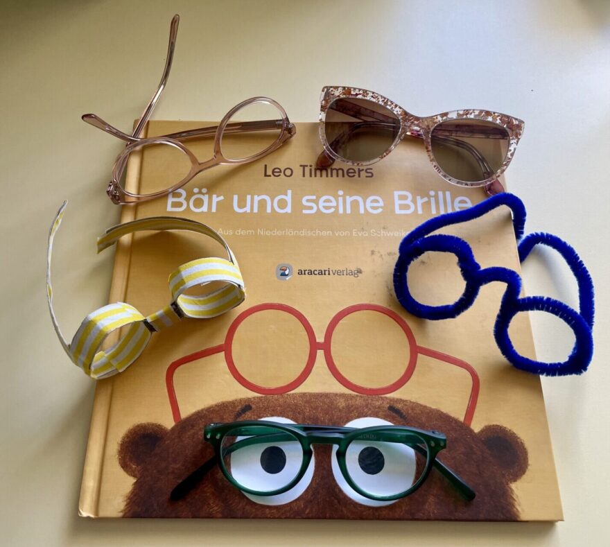Manchmal ist es aber auch etwas ganz Naheliegendes und ein Buch inspiriert mich, weil ich mich mit dem Inhalt des Buchs sehr gut identifizieren kann. Schon immer waren meine Augen sehr gut und obschon ich mir schon als Kind immer eine Brille gewünscht hatte, war dieses Hilfsmittel für mich nie nötig. Stets habe ich mich gefragt, wie es wohl ist, wenn man nicht so genau sehen kann. Nun, seit etwa zwei Jahren kenne ich das Gefühl, wenn Kleingeschriebenes plötzlich nicht mehr so scharf zu lesen ist, wie man sich dies wünschen würde. Vor einem Jahr entschied ich mich dann, dass es Zeit ist für eine Brille. Daher konnte ich dem Bären im Buch «Bär und seine Brille» von Leo Timmers sehr gut nachfühlen und es zauberte sofort ein Lächeln auf meine Lippen. Ich mag Bücher, die ein witziges Ende haben, das bei den Veranstaltungen auch die Erwachsenen schmunzelnd zurücklässt.
