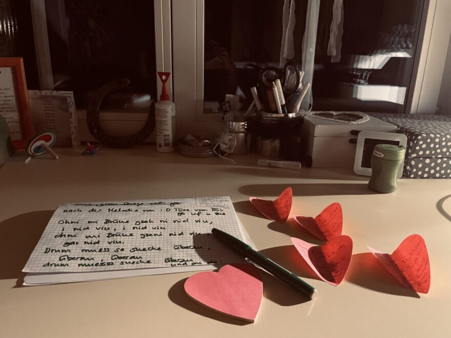 Manchmal ist es aber auch die Nacht, die mich inspiriert. Es kommt vor, dass ich nachts erwache, nicht mehr einschlafen kann und plötzlich fliessen mir die Ideen zu. Am Anfang hatte ich die Illusion, dass ich am Morgen bestimmt noch wüsste, was mir in der Nacht eingefallen ist. Das hat sich aber leider als falsch herausgestellt. So kann es gut sein, dass ich um vier Uhr aufstehe, um Verszeilen oder ganze Verse zu notieren, damit sie sich nicht wie Träume bis zum Morgen wieder in Luft auflösen. Ich liebe es, selbst Verse zu den gewählten Büchern zu dichten. Es freut mich immer, wenn sie wirklich zur Szene im Buch passen.