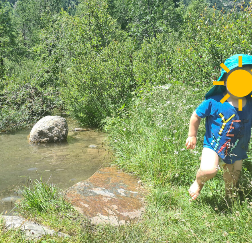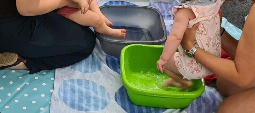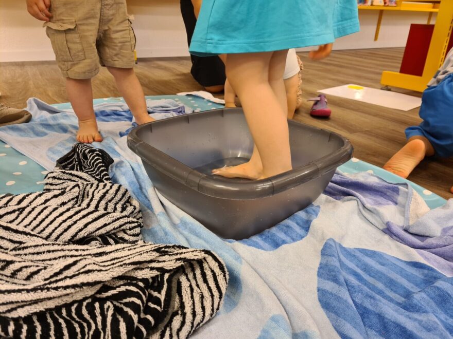 Mit den Füssen an der frischen Luft, können wir auf Entdeckungsreise gehen. Das Gras ist weich und kitzelt an den Fusssohlen, die Steinplatten sind warm oder sogar heiss, kleine Steinchen pieken und immer mal wieder bleibt was zwischen den Zehen hängen. Abkühlung finden unsere Füsse im kühlen Wasser – bspw. in einem mit Wasser gefüllten Becken (z.B. Wäschekorb, Babybadewanne).