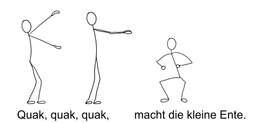 Die grosse Ente hat einen Schnabel so lange wie unsere Arme. Bei «Quak, quak, quak» schliessen wir diesen grossen Entenschnabel dreimal, und zwar so, dass es dabei ordentlich Wasser spritzt. Bei der letzten Zeile können wir selbst immer wieder etwas Neues erfinden: z.B. die Zehen zum Wasser rausgucken und winken lassen oder mit den Händen aufs Wasser patschen.