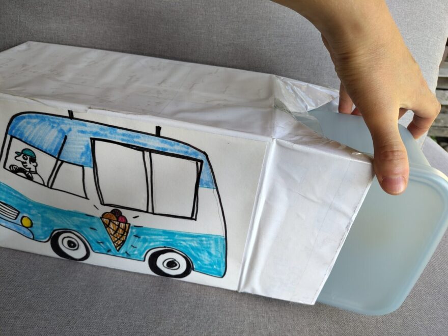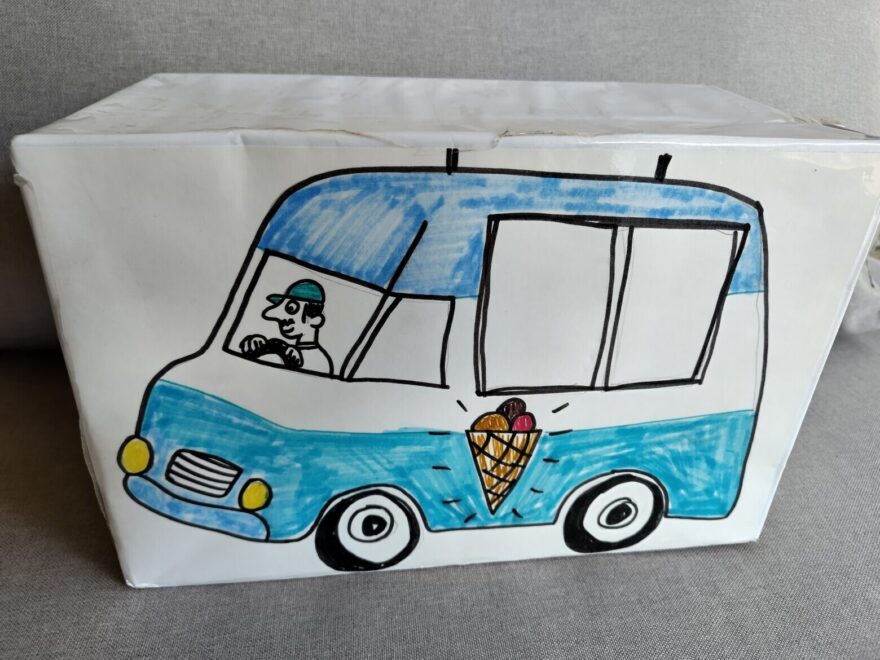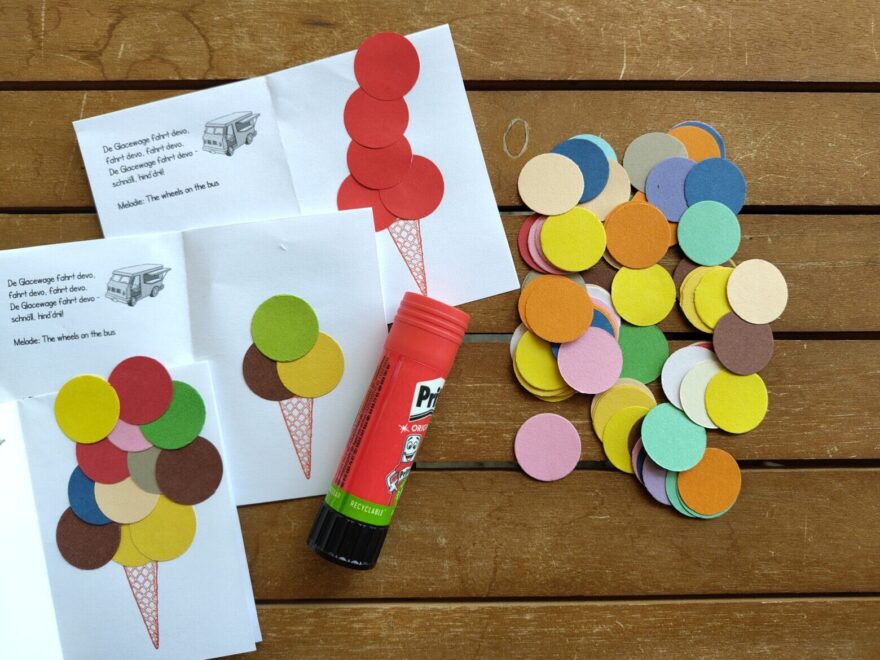 Im Eiswagen drin ist eine Kiste versteckt und darin hat es etwas für die Kinder. Je nach Art und Länge der Veranstaltung, habe ich da verschiedene Versionen zur Hand. Zum Beispiel eine schnelle und eine etwas ausgedehntere Bastelarbeit oder ein Lied (s. oben), ein Minibook oder eine kleine Süssigkeit.