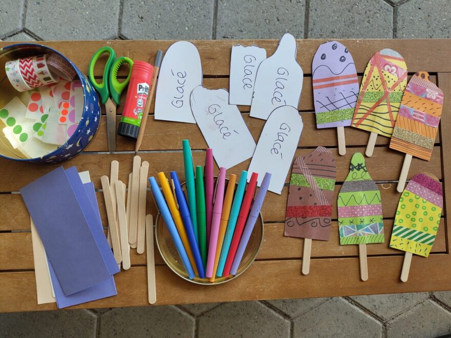 Eine etwas grössere Bastelarbeit: Jedes Kind bastelt sich ein Eis am Stiel und verziert es nach Belieben.