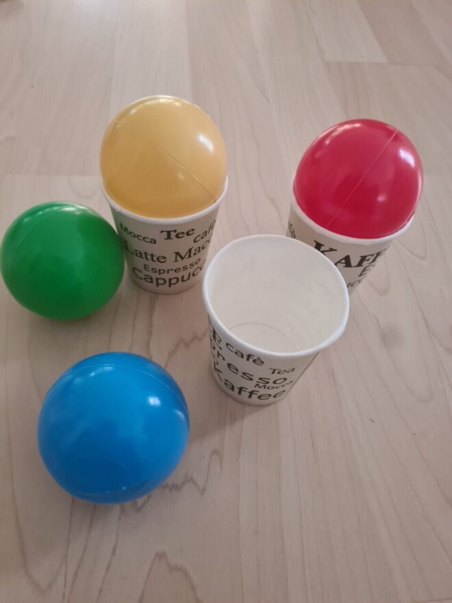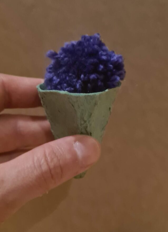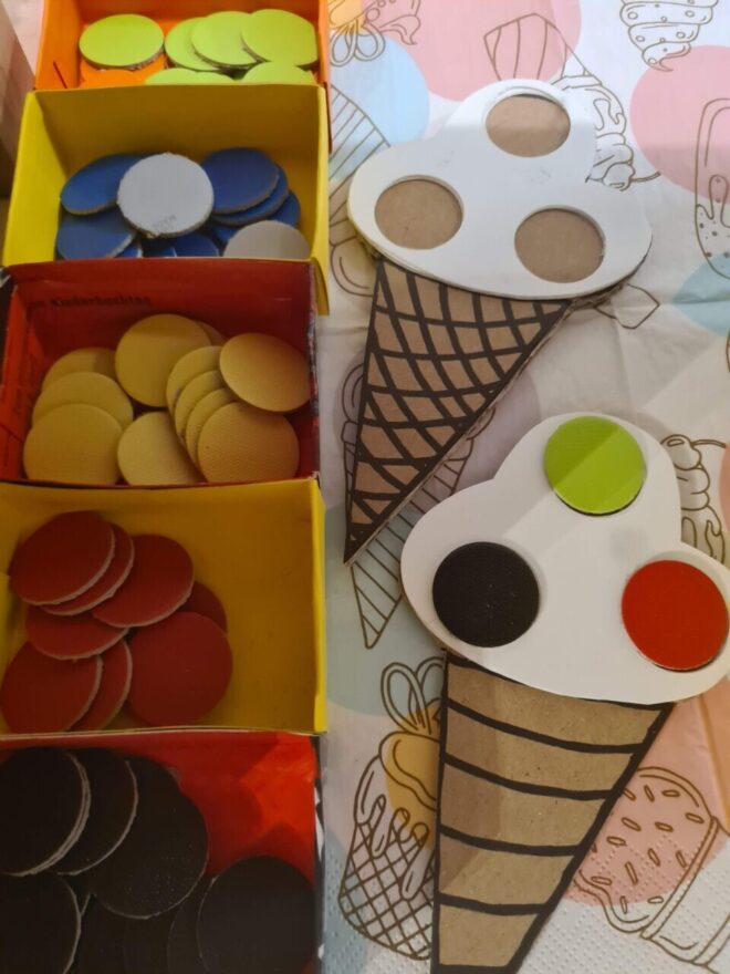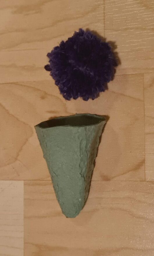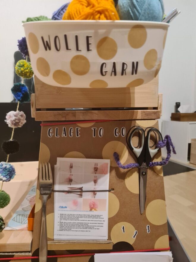 Zusätzlich könnte die “Mitmachstation” noch eine Bastelarbeit enthalten, wobei ein Pompon-Eis selbst gebastelt wird aus Wolle und in einem Eierkarton-Cornet nach Hause genommen werden kann.