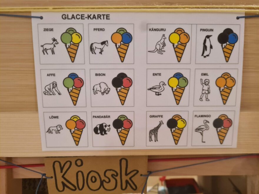 Die Eissorten sind mit Worten und Symbolen beschriftet und können somit bereits von ganz kleinen Kindern gelesen werden. Man kann lustiges Tiereis bestellen und der/die Verkäufer:in stellt anhand der Glace-Karte das richtige Eis her.
