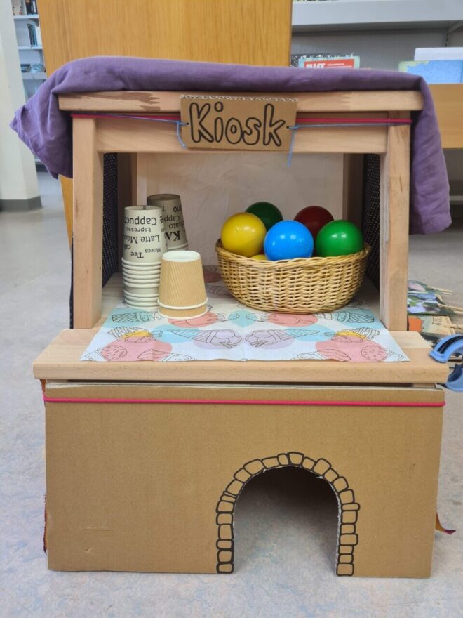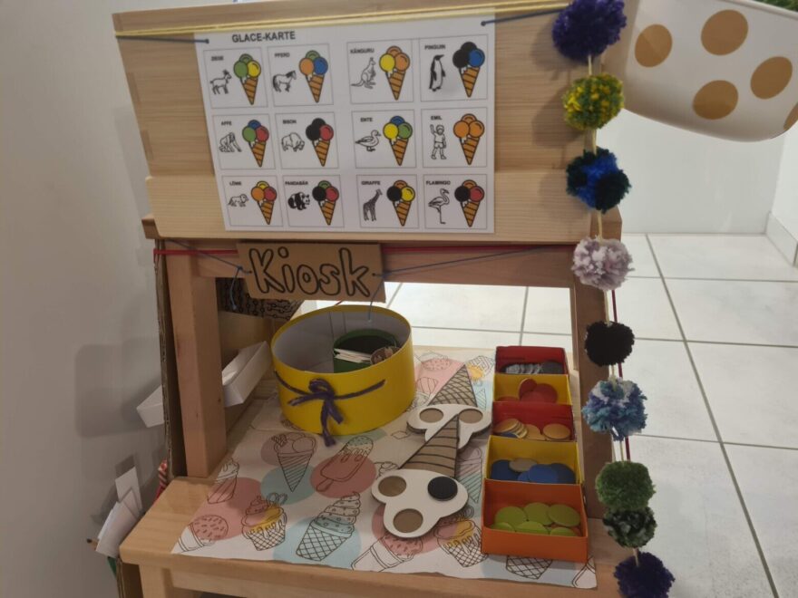 In der Spielgruppe, im Kindergarten, zu Hause oder in der Bibliothek könnte man in einer Spielecke einen Glace-Verkaufsstand oder Kiosk einrichten. Zum Beispiel in Form einer sogenannten «Tritthocker-Mitmachstation» (entwickelt und umgesetzt im Rahmen des Projekts «Drehscheibe Bibliothek»). Dem Tritthocker wurde als Zwischenstock ein Brett eingefügt, damit er rundum bespielt werden kann.
