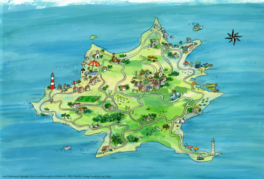 Im Vorsatz des Buches hat es eine Inselkarte. Vom Moritz Verlag habe ich ein PDF dieser Inselkarte erhalten und durfte es für meine Veranstaltungen in A3 ausdrucken. Zusammen mit den Kindern nehme ich während der Veranstaltung immer wieder die Karten zur Hand und wir schauen, wo wir uns befinden, was passiert ist und was allenfalls als nächstes passieren könnte.