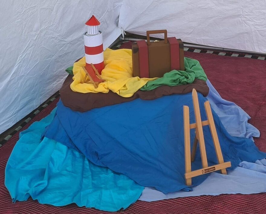 In der Kreismitte baue ich eine Insel mit Leuchtturm auf und wir starten in die Leseanimation mit diversen Fragen rund ums Reisen und Verreisen, u.a.: