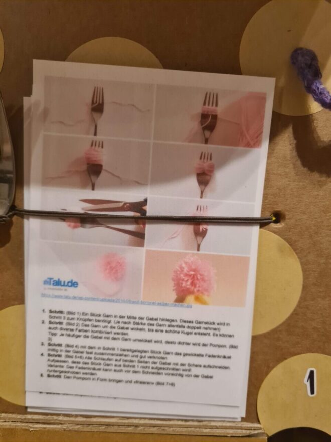 Zusätzlich könnte die “Mitmachstation” noch eine Bastelarbeit enthalten, wobei ein Pompon-Eis selbst gebastelt wird aus Wolle und in einem Eierkarton-Cornet nach Hause genommen werden kann.
