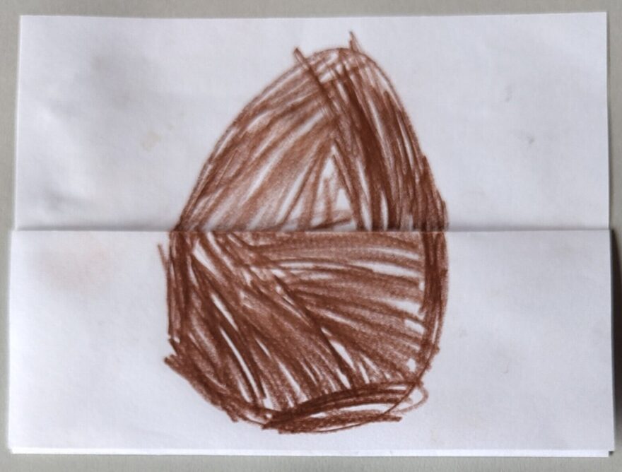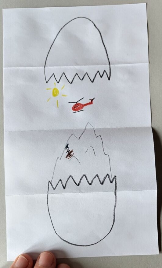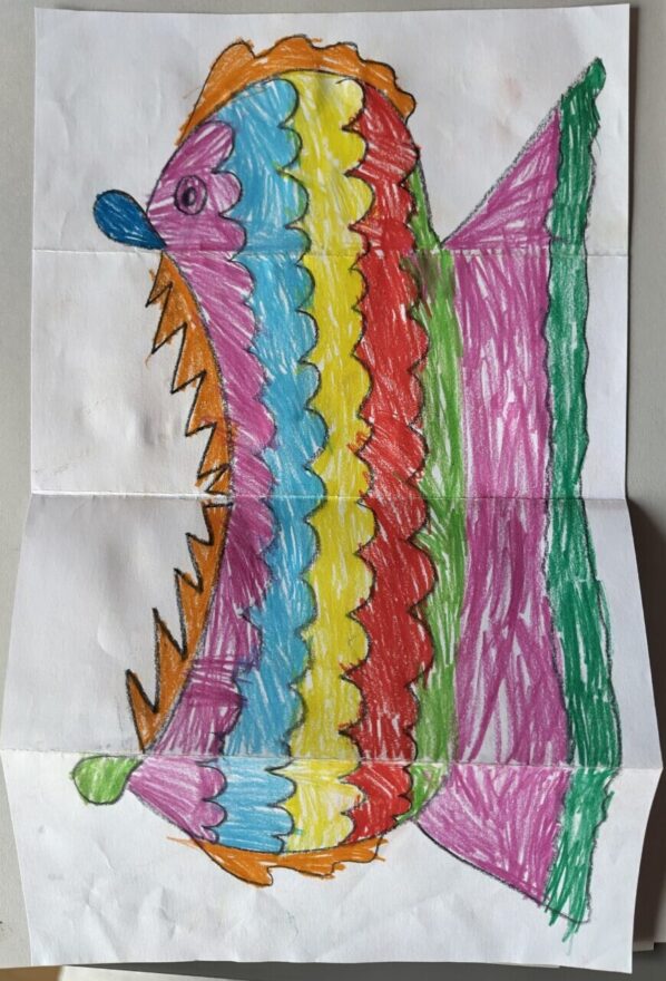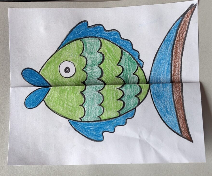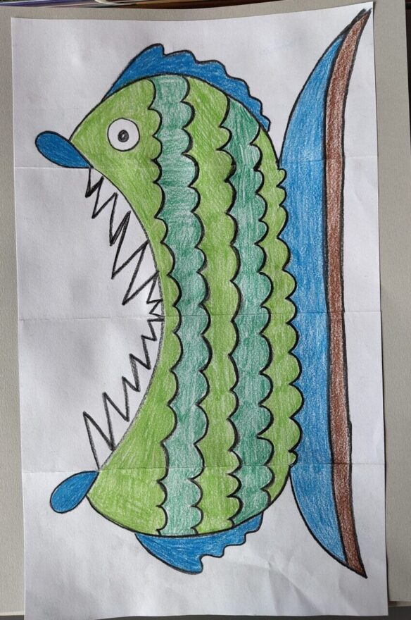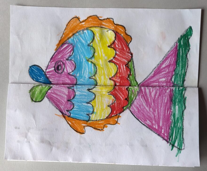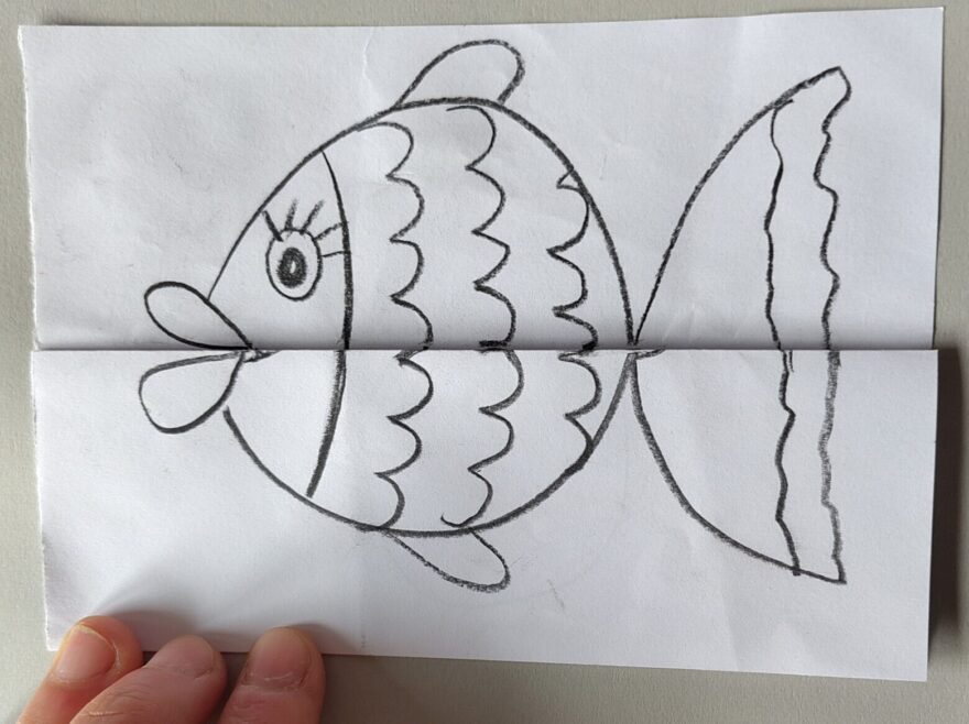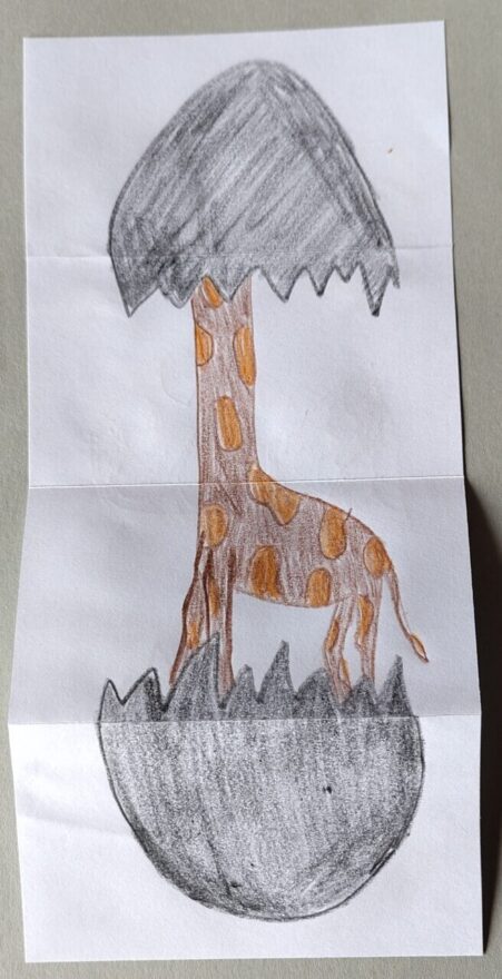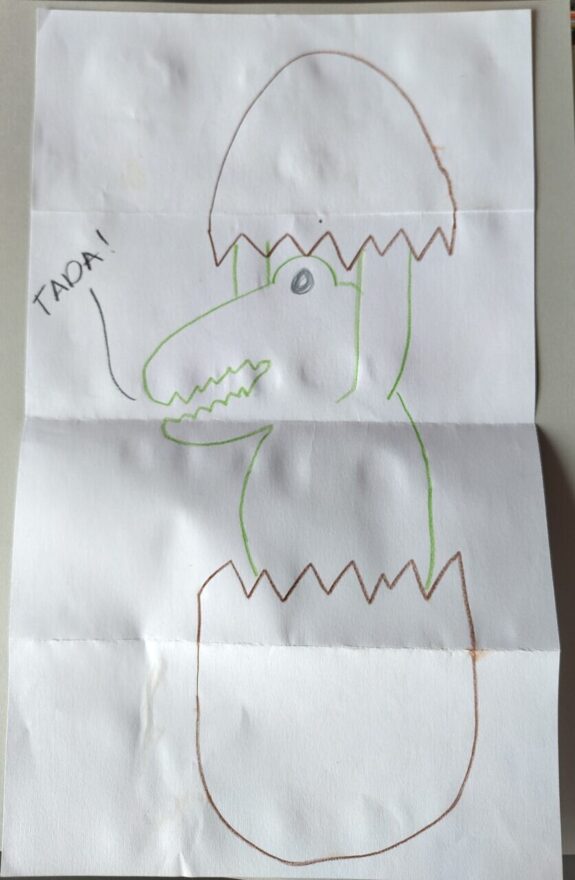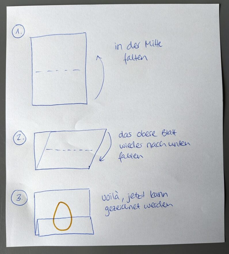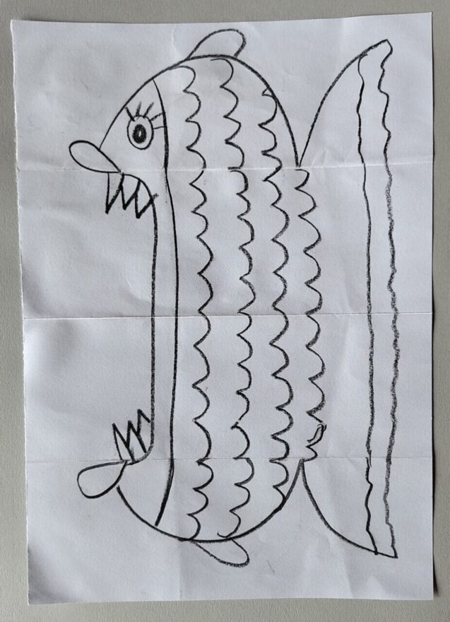 Diese Fisch-Falt-Idee habe ich vor vielen Jahren mal irgendwo in den Weiten des Internets entdeckt. Wir haben die Faltbild-Idee weitergesponnen. V.a. die Überraschungseier haben es uns angetan, da dort wirklich alles Mögliche drinstecken kann und das Ei ziemlich simpel zu zeichnen ist.