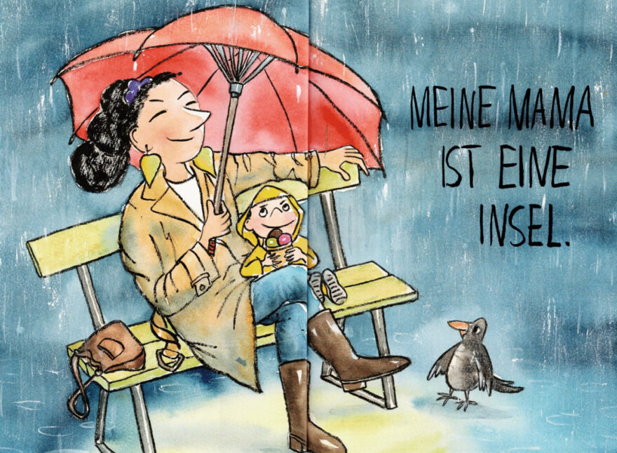 Das sieht doch urgemütlich aus, wie die Mama mit dem Jungen in Claudia de Wecks liebevoll fröhlich illustriertem Bilderbuch «Mama Papa & ich» den Regentag unterm Schirm geniesst. «Mama Papa & ich» oder «Papa Mama & ich» ist ein Wendebuch – von der einen Seite her gelesen sieht man den Jungen und seine Mama, wie sie auf jeder Doppelseite gemeinsam etwas erleben. Jeweils in einem Satz steht ein liebevoller Vergleich, wie bspw. «Meine Mama ist eine Lokomotive». Die Erklärung dazu findet sich in der herzlich lustigen Illustration von Claudia de Weck. Wendet man das Buch wird aus der Perspektive des kleinen Mädchens erzählt. Auch dort werden kleine Komplimente gemacht und Vergleiche liebevoll und humorvoll dargestellt. Mal ist der Papa Giraffe, mal Leuchtturm, mal Schutzengel. Sollten Sie also Ihren Regentag drinnen verbringen, garantiert dieses Buch wunderbares Vorlesevergnügen und vielleicht stellen Sie gemeinsam mit Ihrem Kind die eine oder andere Szene gleich nach?