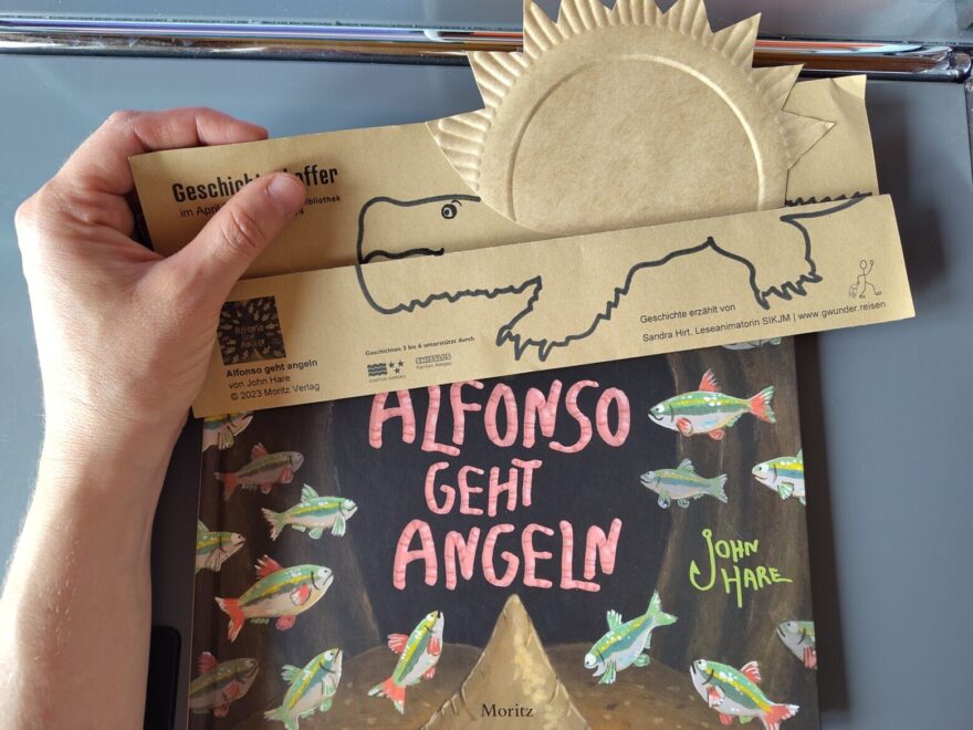 Diese Faltidee integrierte ich auch schon mal in eine Leseanimations-Veranstaltung zum Bilderbuch «Alfonso geht angeln» von John Hare, Moritz Verlag 2023. Dabei war die gefaltete Geierschildkröte gleichzeitig Bastelarbeit und Vers-Blatt, um nach Hause zu nehmen.