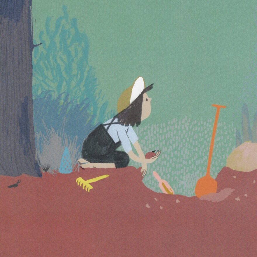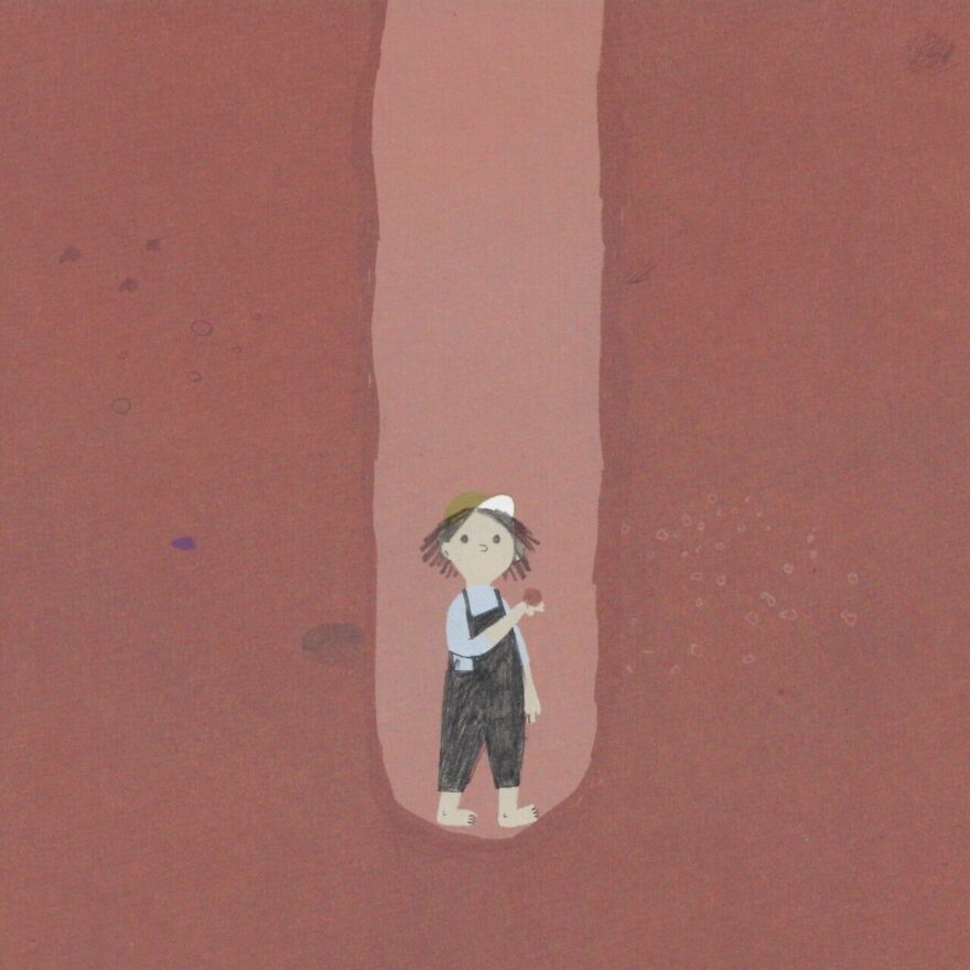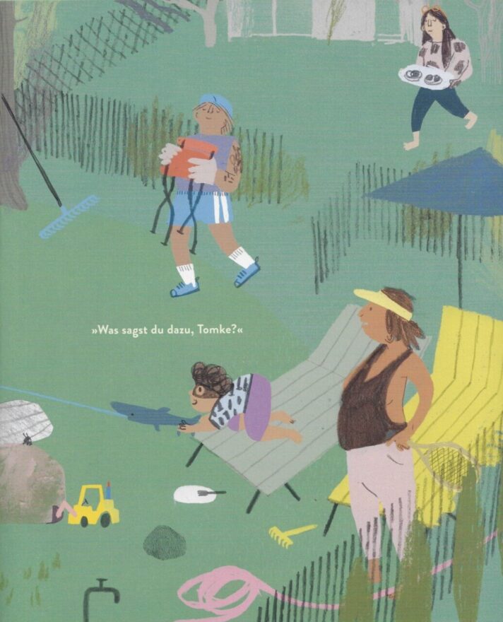 Tomke ist ganz bei sich, im Hier und Jetzt und kann all die Vorschläge, was denn jetzt aus dem gegrabenen Loch entstehen könnte (Versteck für den Piratenschatz, Teich, Swimmingpool, Geheimgang, Weg zum Erdmittelpunkt etc.), ausblenden. Selbst die letzte und auffordernde Frage der Erwachsenen «Was sagst du dazu, Tomke?» bleibt unbeantwortet. Lieber schenkt Tomke die Aufmerksamkeit den kleinen Dingen, die es in und auf der Erde zu entdecken gibt.