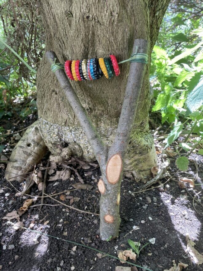 - Garn durch ein Loch im Ast der Astgabel ziehen und gut festknoten