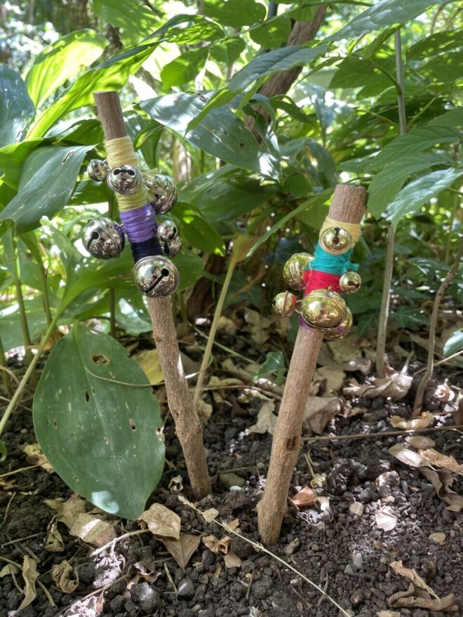 Im Wald angekommen werden Stecken gesucht für die Herstellung der Waldinstrumente. Die Waldinstrumente können gleich vor Ort oder aber zurück zu Hause hergestellt werden.