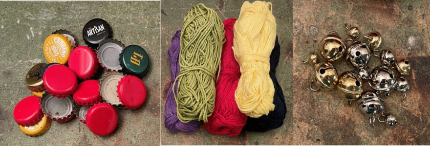 - 1-2 Metalldeckel auf je eine doppelte Garnschnur aufziehen