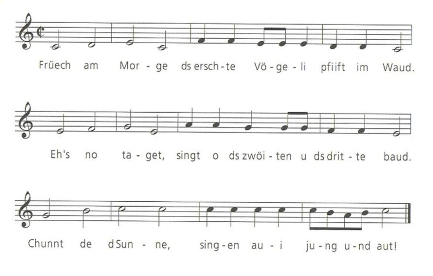 Damit der Weg nicht ganz so lang ist, wird die Vorfreude auf den Waldtag zelebriert mit einem Spassreim und einem Morgenlied: