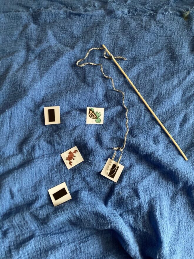 Damit Sören seinen Song komponieren kann, lässt er sich viel Zeit, um Ideen im Meer zu suchen. Diese Zeit lassen wir ihm und gehen angeln. Ich habe für jedes Kind eine Angelrute aus einem Holzspiessli, einer Schnur und einer Büroklammer gebastelt und auf dem Meer aus blauen Tüchern viele laminierte und auf der Rückseite mit einem Magneten versehene Bilder von Meerestieren ausgelegt.