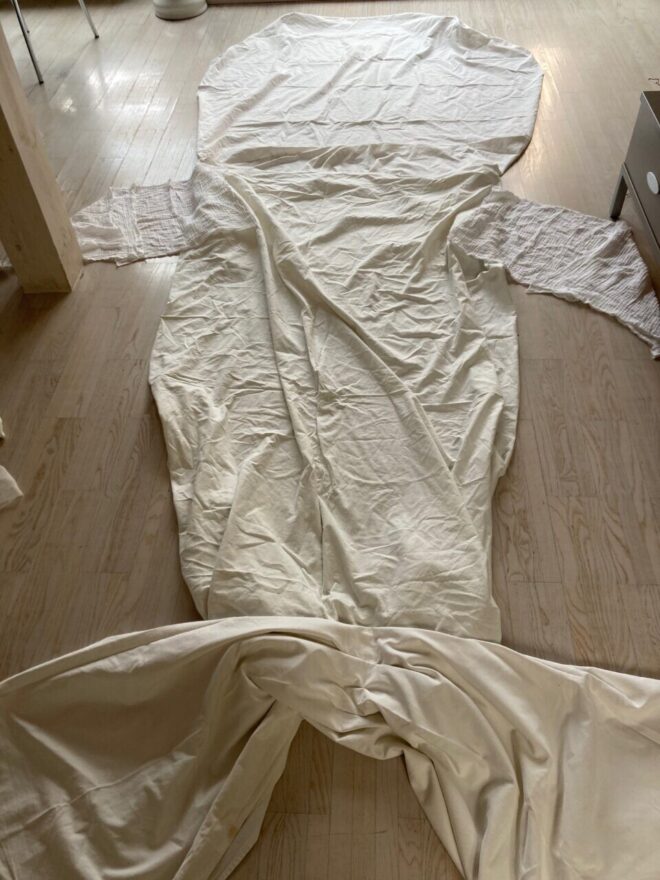 Zum Start der Veranstaltung ist die Kinoleinwand noch schwarz. Dazu spiele ich einen Buckelwal-Gesang aus dem Internet ab und frage die Kinder, was sie hören. Danach gebe ich ein paar Facts zum Buckelwal wieder und frage die Kinder, wie gross denn so ein Buckelwal sein könnte. Ein Buckelwal wird bis zu 18 Meter gross- wie gross ist das denn? Das ist für die Kinder (und viele Erwachsene) natürlich unvorstellbar gross. Darum gehen wir uns gemeinsam einen aus Tüchern bereitgelegten Wal anschauen. Dieser ist ca. 4 Meter lang, also so gross wie der junge Sören aus dem Buch.