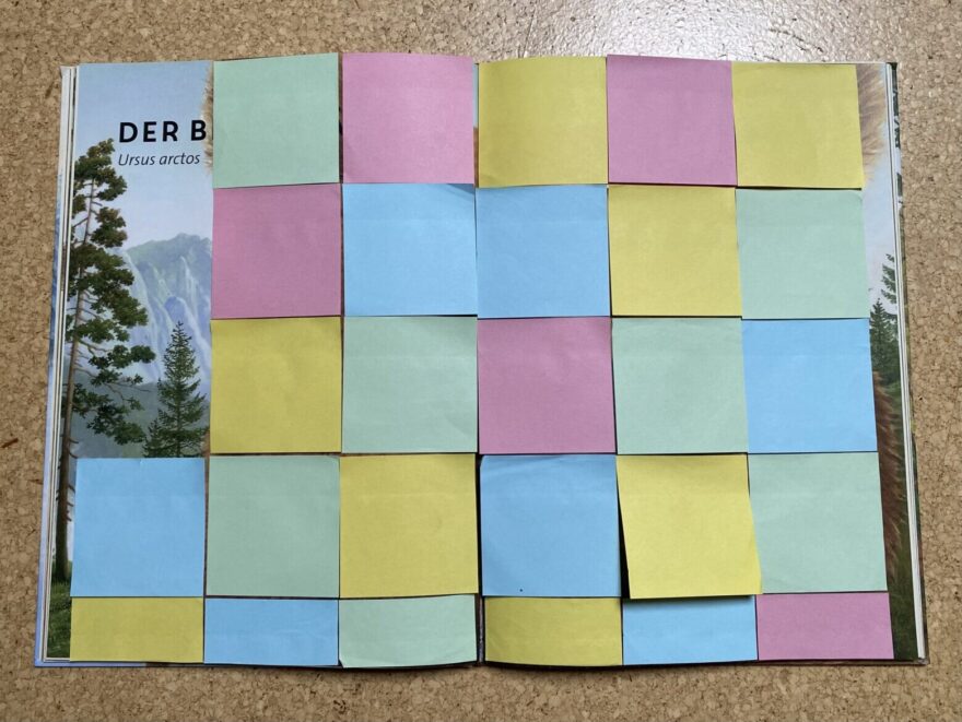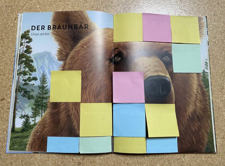 In diesem Fall habe ich das Bild des Bären mit Post-its abgedeckt. Die Kinder dürfen diese reihum aufdecken und raten, wer sich hier verstecken könnte. Anschliessend schauen wir den Bären genau an und staunen, wie gross dieser ist. Auch vergleichen wir seine Pfoten mit unseren Händen.