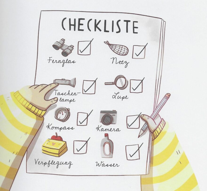 Z.B. einen Feldstecher – aber wofür? Nun kontrollieren wir anhand der obenerwähnten Packliste, ob wir alles haben.