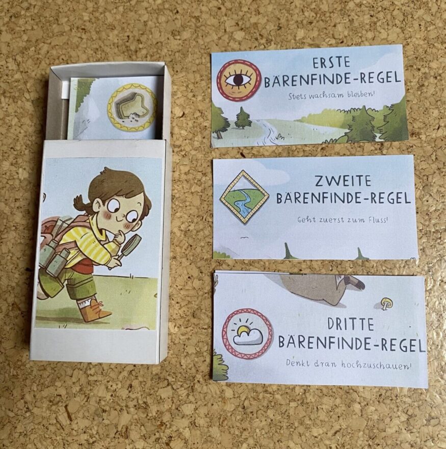 Mia kennt zehn Regeln, wie man einen Bären findet. Dazu benützen wir jeweils vor jeder Regel folgendes Ritual: In einem Schächtelchen sind alle Symbole versteckt. (diese sieht man jeweils auf jedem Bild oben links) Dazu sprechen wir jedes Mal den Vers: