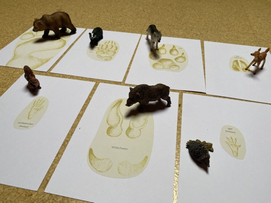Bei Regel 7 helfen wir Mia mit den Spuren. Aus dem bereits oben erwähnten Sachbuch „Lebensgross“ habe ich diverse Waldtierspuren herauskopiert. Diese lege ich nun auf den Boden. Mit Hilfe von „Schleich“-Tieren ordnen die Kinder die Spuren zu.