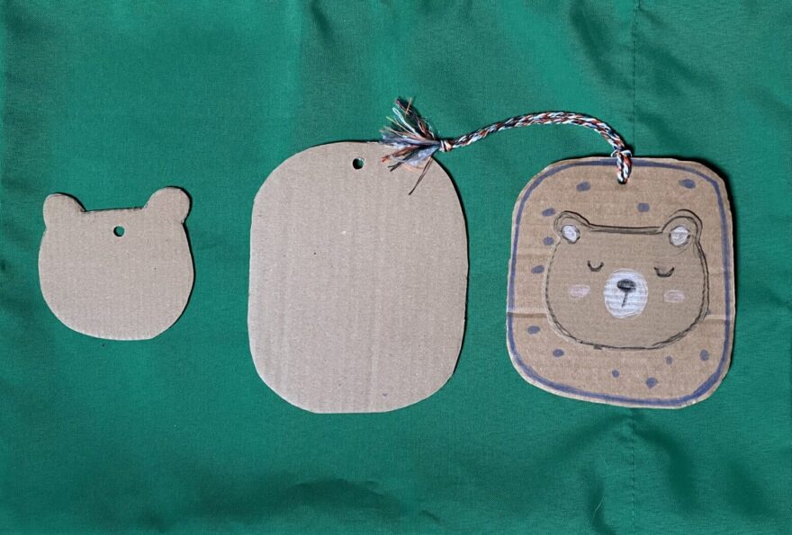 Da bei dieser Geschichte das Erzählen, Miträtseln und Bewegen sehr viel Zeit braucht, reicht es nur noch für eine kurze Bastelei. Die Kinder dürfen ein Bärenbild anfertigen. Dazu erhalten sie einen Rahmen und einen Bärenkopf; beides sollen sie bemalen. Zum Schluss werden die beiden Teile zusammengeklebt und mit einer Schnur versehen (die Idee habe ich bei Instagram @hyokim_crafts gefunden).