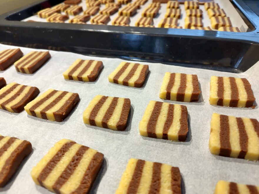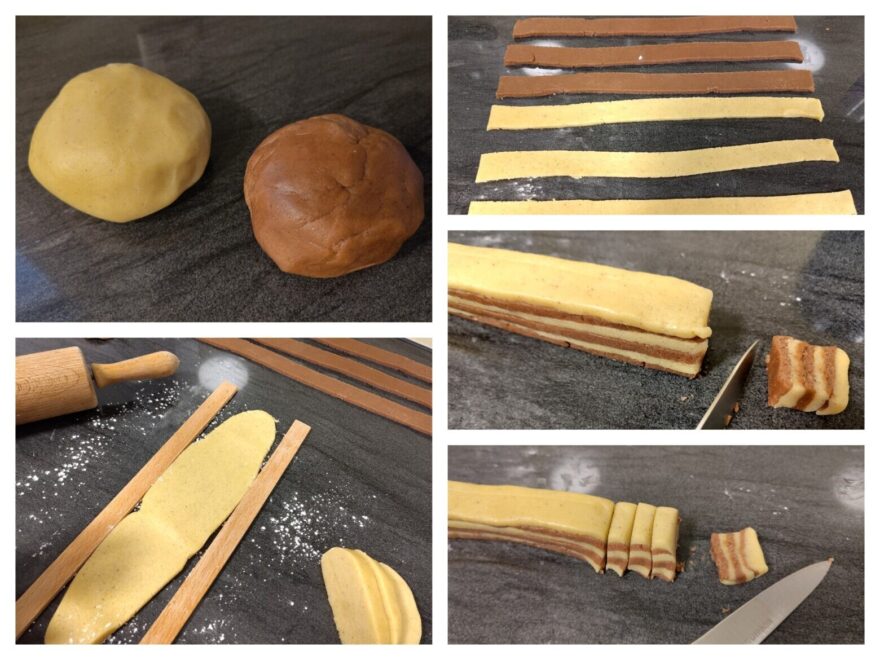 Abwechslungsweise einen hellen und einen dunklen Streifen aufeinanderlegen, jede Lage mit Eigelb oder Wasser bepinseln und gut andrücken - Den Streifenblock in dünne Scheiben schneiden = Guetsli