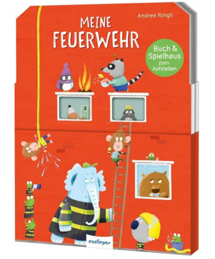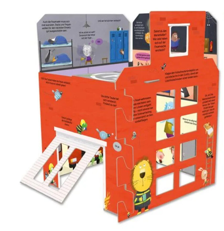 Dieses wunderbare Buch verwandelt sich innert Sekunden in ein Feuerwehrmagazin. Gemeinsam mit tierischen Feuerwehrhelden entdecken die Kinder die Feuerwehrstation samt Helikopterlandeplatz und einem (noch) leeren Magazin. Das grosse Tor und die Fenster lassen sich bei dem Spielhaus aus Pappe leicht öffnen. Falls es mal eilt, flitzen die Tiere die Rutschstange hinunter direkt ins Einsatzgeschehen.
