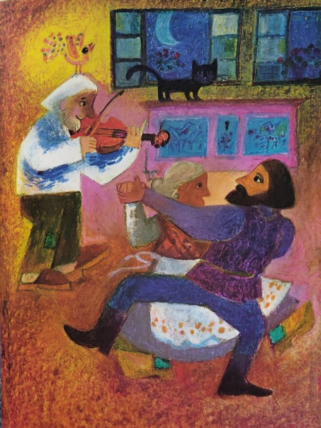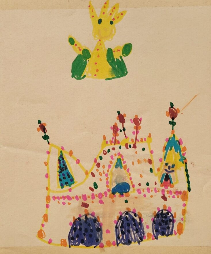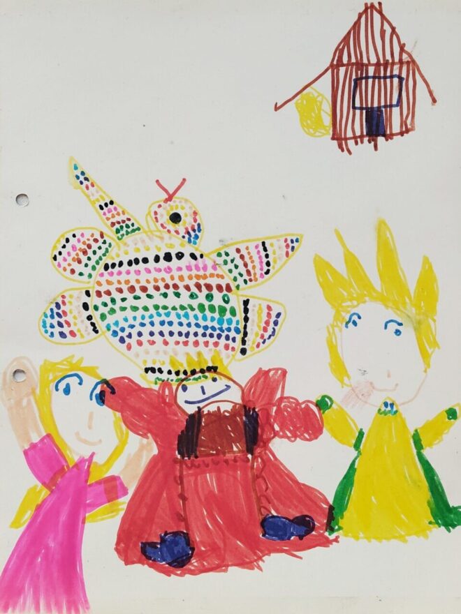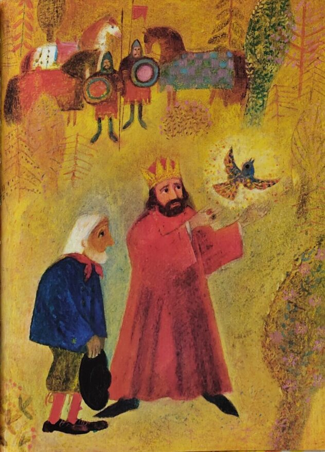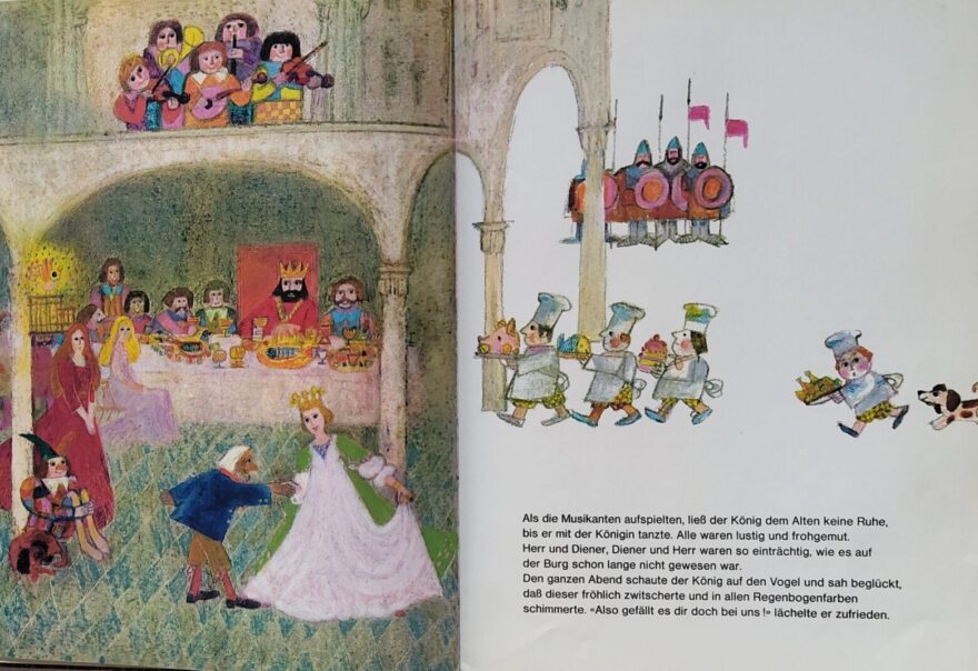 Die Illustrationen berühren mich auch heute noch und haben ihren Glanz und ihre Farbigkeit nicht eingebüsst. Hingegen sehe ich am Text die Spuren der Zeit. Aus heutiger Sicht wirkt er veraltet. Als Kind muss mich die Botschaft, dass der Vogel sich sein Zuhause selbst sucht und lieber in einer einfachen Hütte statt in einem Schloss lebt, sehr beschäftigt haben. In Zeichnungen entstand mein Vogel «Glück» in verschiedenen Variationen. Natürlich faszinierten mich damals auch der König und die tanzende Königin im Schloss!