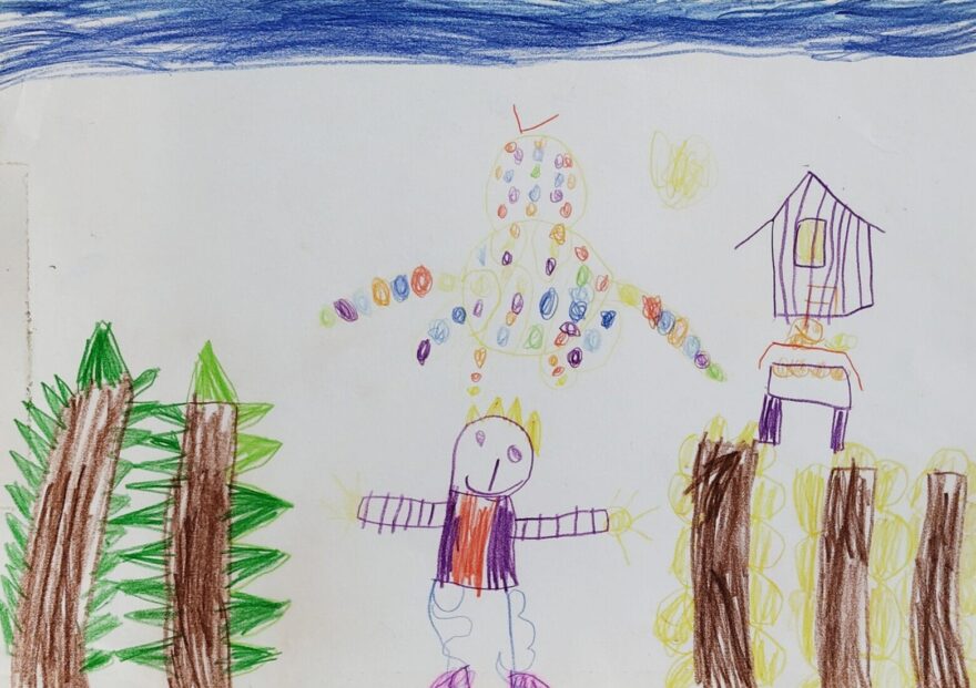 Beim Ausmisten von alten Erinnerungsschätzen stiess ich kürzlich auf meine Zeichnungen des Vogels «Glück». Die Bilder müssen, anhand des Datums auf der Rückseite, im Kindergartenalter entstanden sein. Sie wecken auch jetzt, nach 50 Jahren, erneut die Erinnerungen an meine damalige Faszination an das Bilderbuch. Vor meinem inneren Auge tauchen die farbenfrohen Illustrationen von Palaček auf. Beim anschliessenden Durchblättern und Anschauen des Bilderbuches, werden diese bestätigt.
